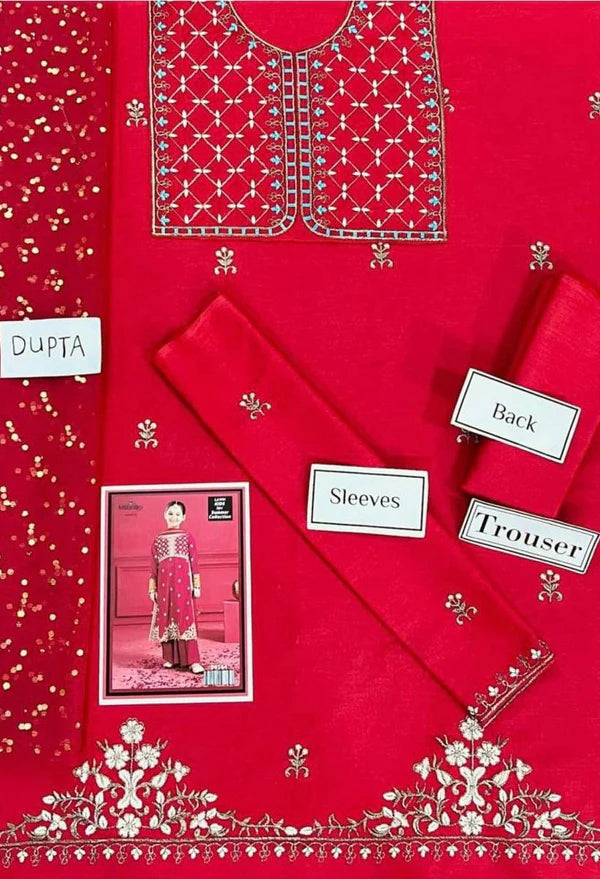 Kids 3PC Embroidered Lawn Dress With Net Dupatta - Unstitched - RC01