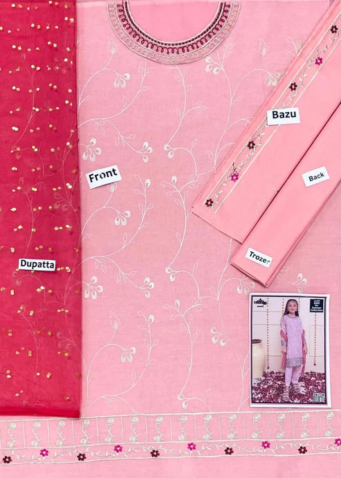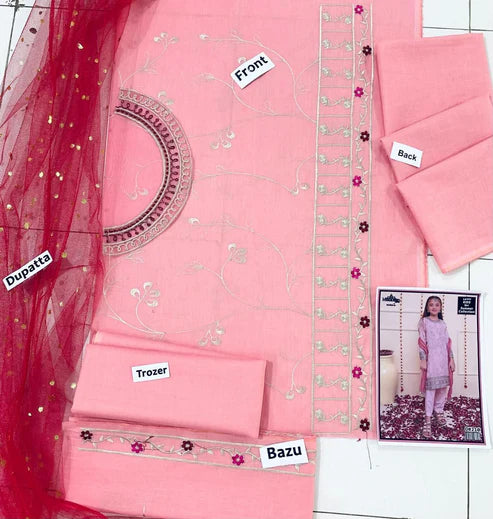 Kids 3PC Embroidered Lawn Dress With Net Dupatta - Unstitched -RC509